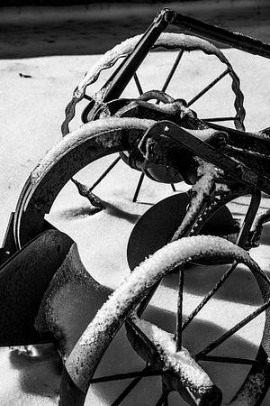 Old farm equipment rusted and frozen in the snow at Caumsett State Park.