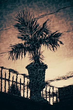 A palm plant's silhouette reflects in a backyard pool as the sun sets in Huntington, NY.