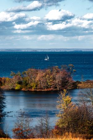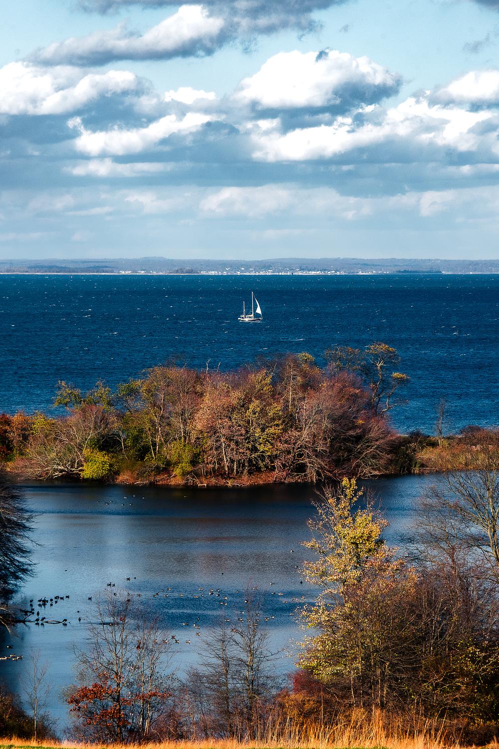A sailboat cruises through the Long Island Sound beyond the fall foliage of Caumsett State Park.