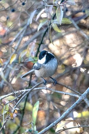 A Chickadee puffs out his chest, hoping for a handful of seeds at Elizabeth Morton Wildlife Sanctuary in Sag Harbor.