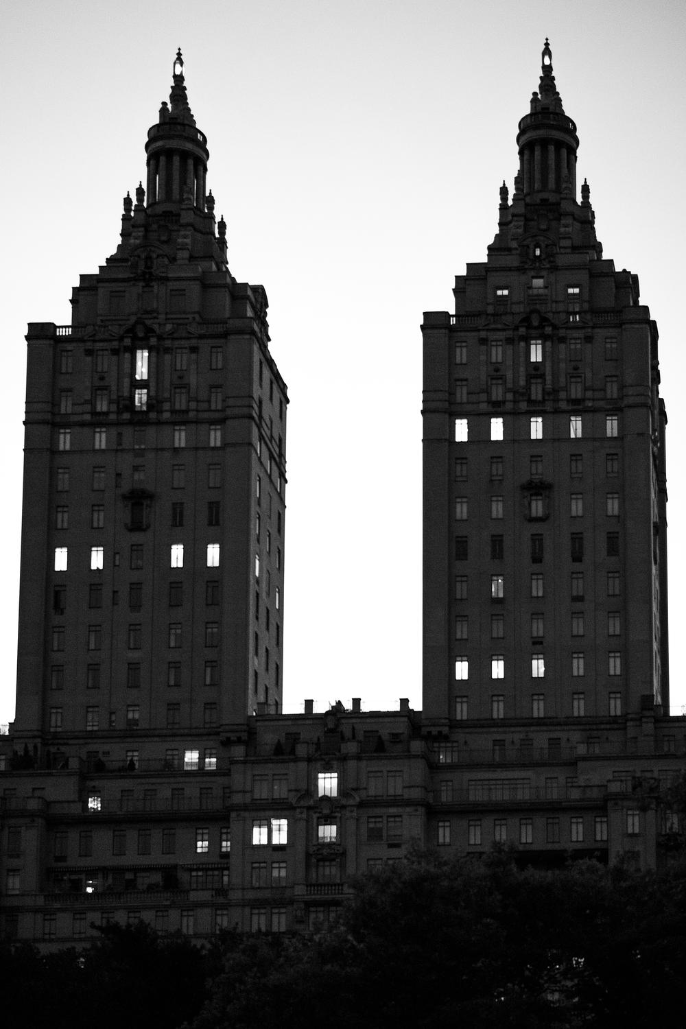 The two towers of the El Dorado building on Central Park West standing against the dying light of dusk.