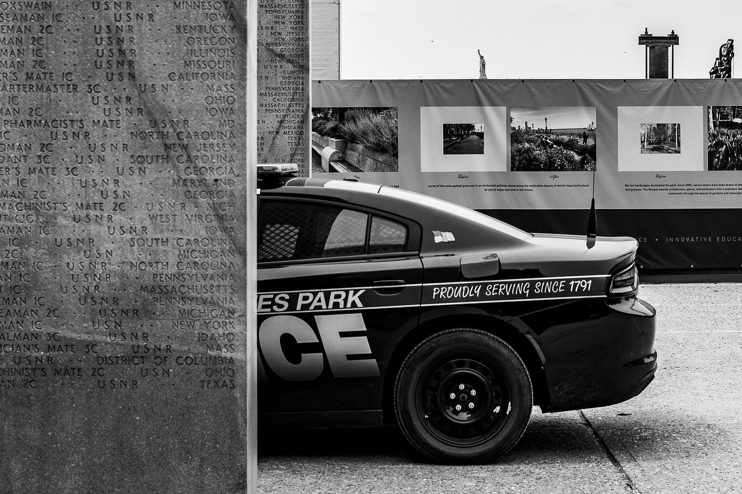 Park police parked between the stone pillars of the East Coast WWII memorial with the Statue of Liberty rising above in the background.